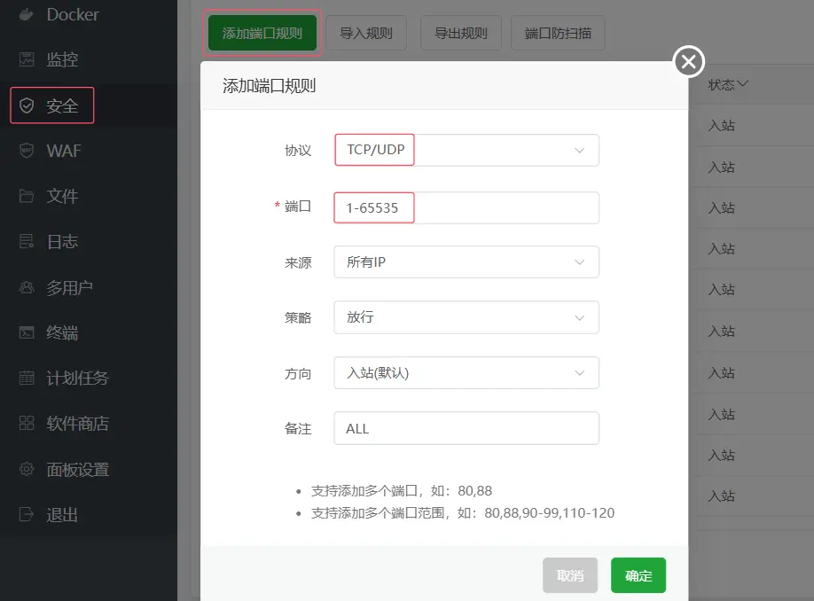 然後在寶塔菜單安全中添加端口規則,協議選擇 TCP/UDP,端口填寫 1-65535,開放所有端口。