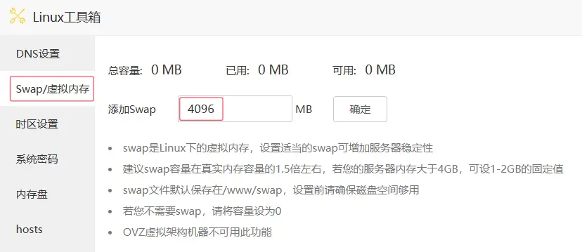 先設置虛擬內存,使用 Linux 工具箱添加 Swap,由於遊戲佔用內存並不大,建議 2G 內存的服務器添加,比如添加 4G 虛擬內存。