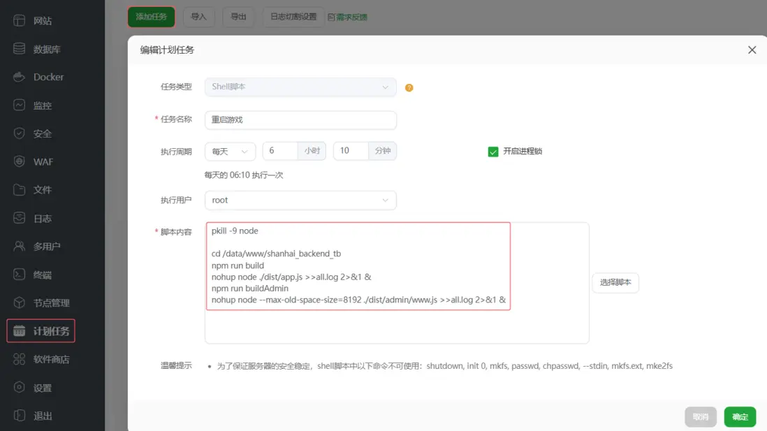 遊戲建議每天至少重啓一次,保證遊戲的穩定性,通過寶塔計劃定時執行重啓遊戲命令: