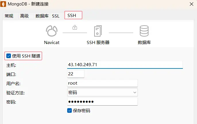 使用 SSH 連接,勾選使用 SSH 隧道,填寫主機服務器 IP,用户名密碼是你服務器的用户名密碼,點擊確定。