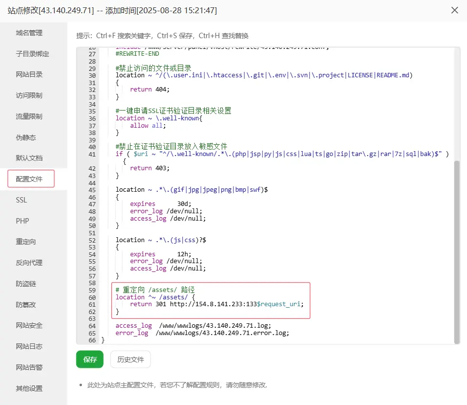 我們使用重定向的方式獲取資源服務器遊戲資源。修改遊戲服務器的站點IP:81,配置文件中添加重定向代碼: