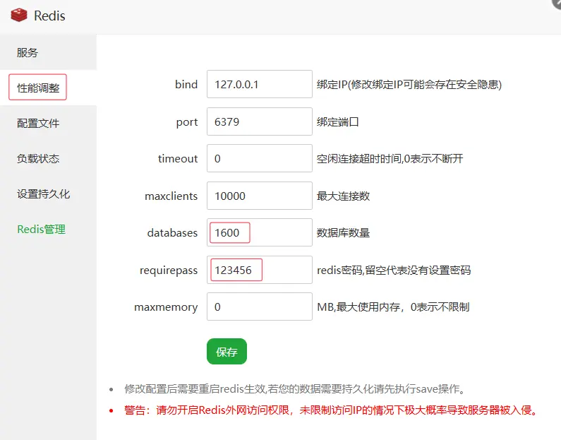 然後配置 Redis,在性能調整中將密碼 requirepass 修改為 123456,同時將數據庫數量 databases 修改為 1600。