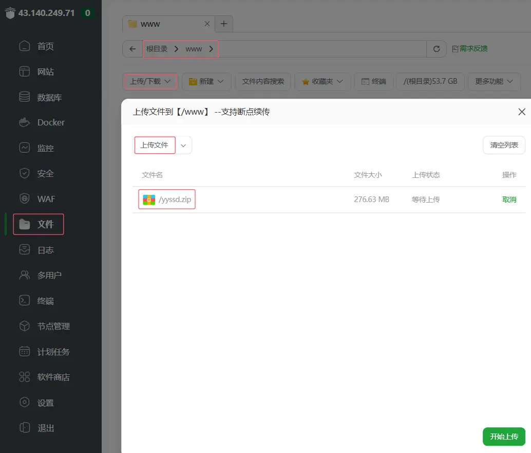 拿到源碼後,將yyssd.zip壓縮文件通過寶塔上傳到根目錄,由於最新的寶塔禁止直接上傳到根目錄,可以先上傳到任一目錄下,再剪切粘貼到/根目錄。或直接通過 finalshell 工具直接上傳到根目錄也可以。