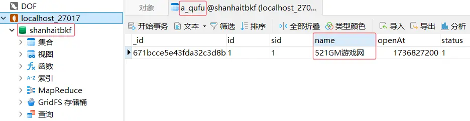 區名修改很簡單,打開 Navicat 連接 MongoDB,打開數據庫shanhaitbkf集合a_qufu,修改name即可,重啓遊戲後生效。