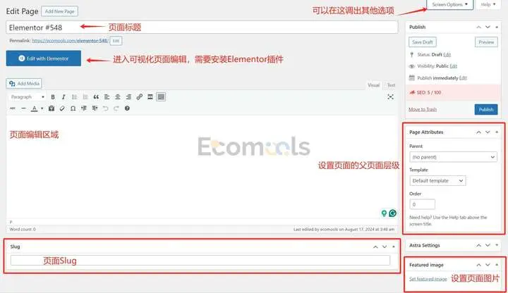 Add New Page跟Add New Post的界面類似,區別是添加頁面的時候不能夠選擇分類。