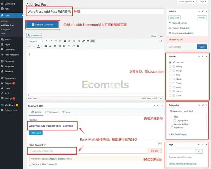 Add New Posts 可以創建新的文章,可以使用WordPress的編輯器添加文本、圖片、視頻等內容。有些主題默認是塊級編輯器(個人用不習慣)。如果我們安裝了Elementor插件,那就可以點擊左邊的 Edit with Elementor 按鈕進入可視化編輯界面。