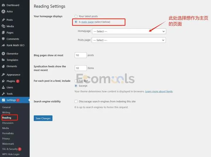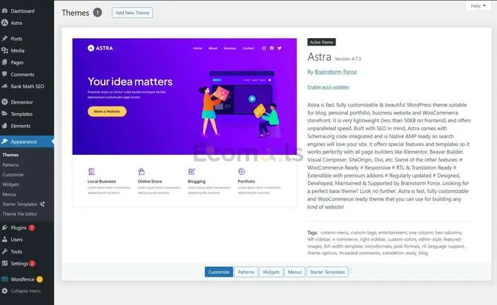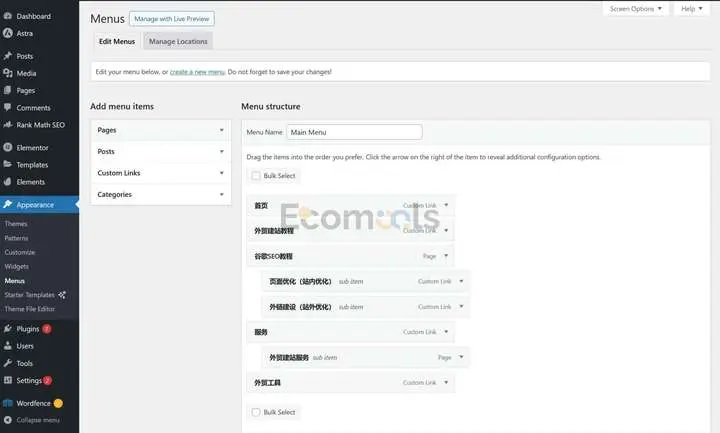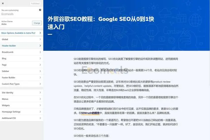 注意:我是用的是Astra主題,如果你使用的是其他主題,那麼界面以及選項會有不一樣的地方。但是設置管理側邊欄的步驟都是共通的: