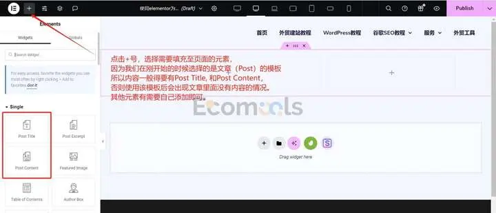 8. 填充左側容器元素。設置大容器的排列方式後,點擊左上角“+”號, 可以讓我們選擇需要填充至頁面的元素。因為我們現在編輯的是Posts的模板,所以要將標題(Post Title)和內容(Post Content)放置到左側容器中(你也可以放置在右側容器,那麼左側容器就放側邊欄)。不然的話,你將模板發佈並應用至全部文章後,你就會發現你的所有Post都沒有標題和內容。