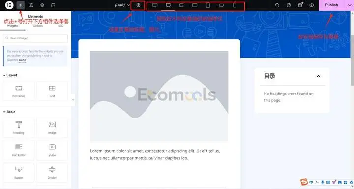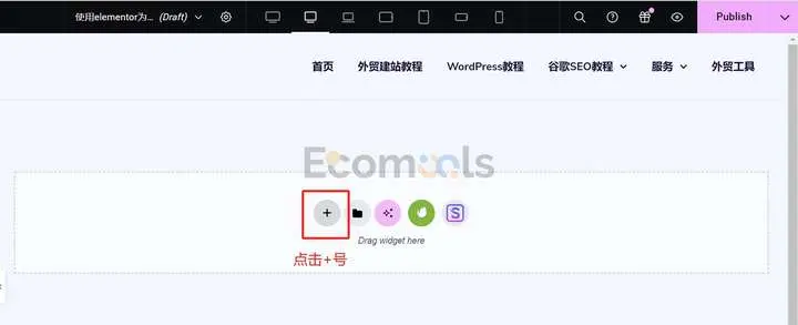 點擊Edit with Elementor進入可視化頁面編輯界面後,可以通過拖拽組件的方式來進行頁面製作。左邊就是可用的組件,鼠標按住拖到右邊的區域即可。
