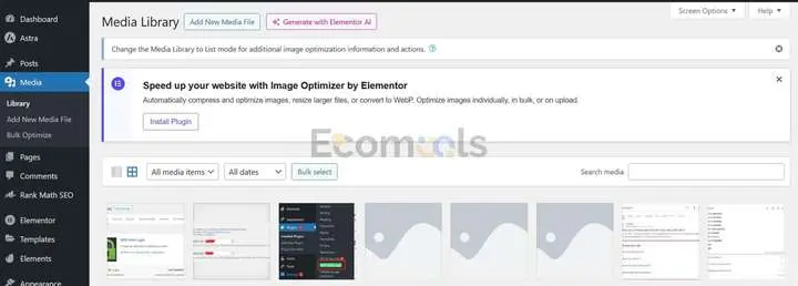 Add New Media File就是我們上傳網站內容的地方。Bulk Optimize不是WordPress自帶的而是安裝EWWW這個圖片壓縮插件才有的選項。EWWW可以幫我們自動壓縮上傳的JPG圖片(免費版本),壓縮其他格式的圖片需要Premium版本。