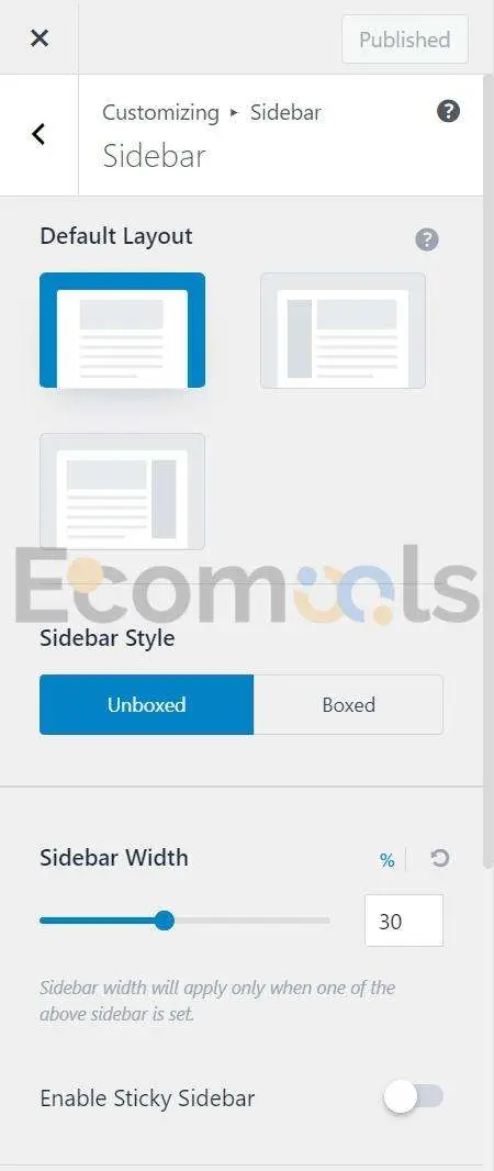 以Astra主題為例,這邊可以管理側邊欄的展示方式(左側、右側還是不顯示側邊欄)以及側邊欄的寬度。具體的側邊欄設置選項會根據主題的不同而不同。選擇你希望的側邊欄展示方式,點擊Published後,刷新頁面即可看到更改。