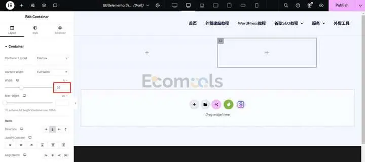 6. 調整小容器。選擇完佈局結構以後,Elementor生成了三個容器,一個大容器,大容器裏面有左右兩個小容器。鼠標移動至右側小容器,點擊左上方的設置,調出容器設置選項,我們在這裏調整側邊欄的寬度。
