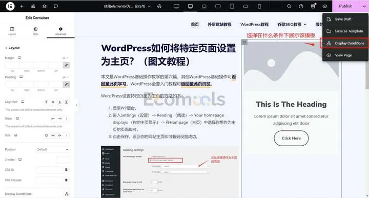 12. 設置Post模板的條件邏輯展示。點擊右上側的下箭頭,選擇Display Conditions(注意,這個是Post模板的展示條件,第12步是右側容器的展示條件,可以組合使用。)