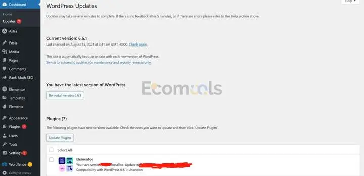 Updates裏面是WordPress版本、主題、插件的更新彙總。在更新之前,推薦先備份網站,以防更新後出現問題。