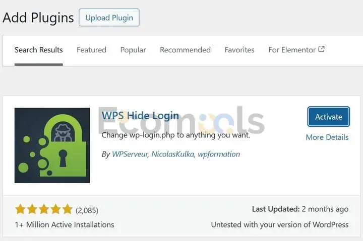 在WordPress儀表盤中,搜索插件WPS Hide Login,選擇安裝,然後激活。