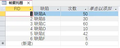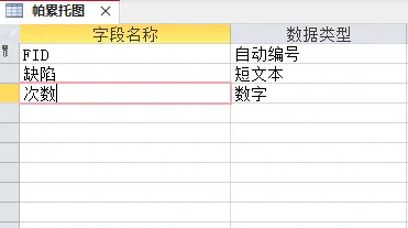 假設我們有一張缺陷記錄表,具體字段如下圖,表名我們就保存為帕累託圖。自己在表中適當的放入一些數據。