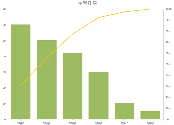 帕累託圖(Pareto Chart),又叫排列圖或主次圖,是一種將柱狀圖和折線圖結合在一起的統計圖表。它是質量管理(QC)七大手法之一,核心目的是為了“抓主要矛盾”。