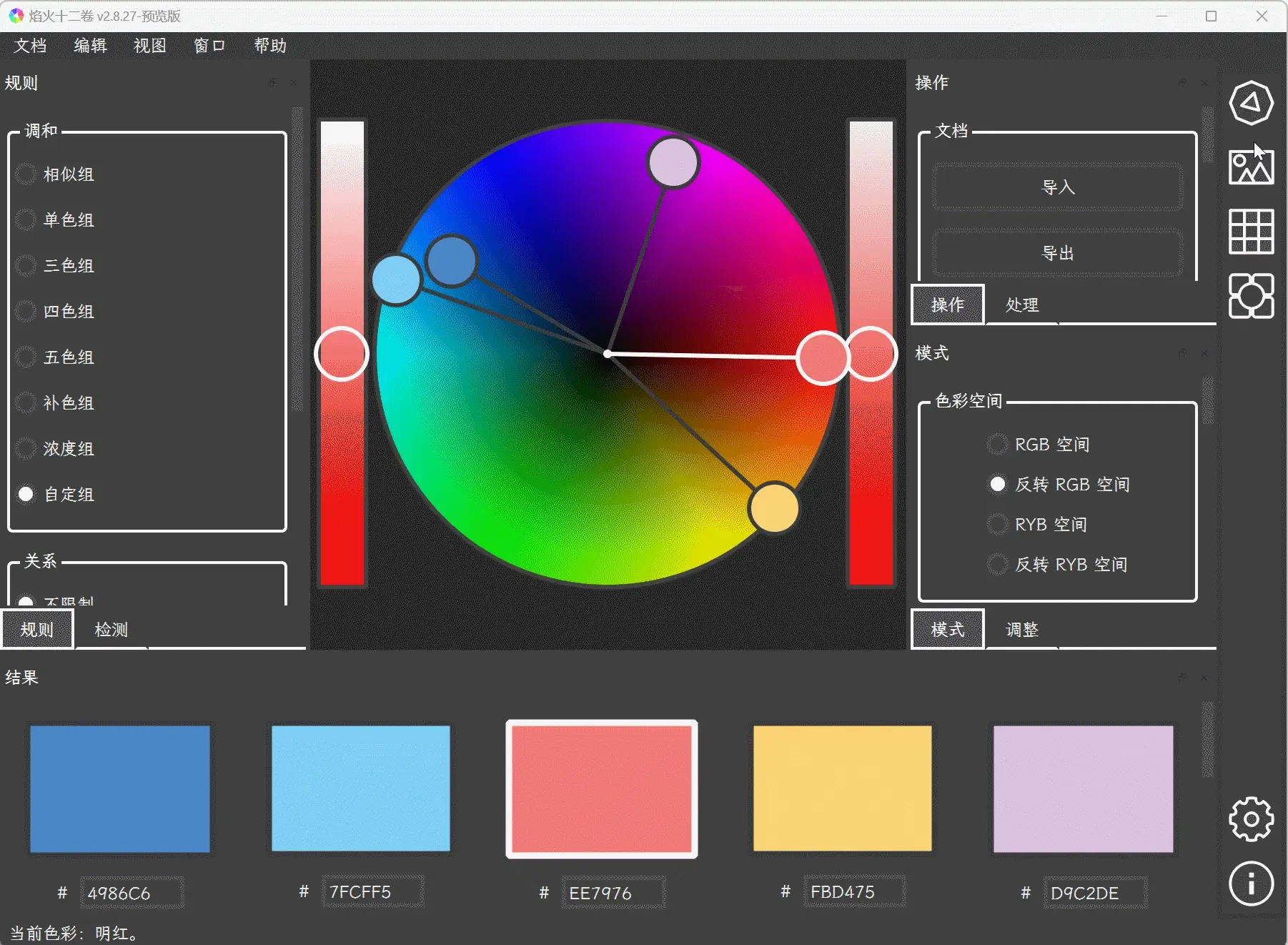 焰火十二卷新版本支持 RGB 和 RYB 兩種色彩空間。RYB 色彩空間是一種以紅、黃、藍為三原色的色彩模型,適合顏料混合的色彩表達。RYB 色彩空間廣泛應用於繪畫、印刷和藝術設計等領域,它能營造出豐富的色彩效果和對比度。在 RYB 色彩空間中,紅色和黃色混合出橙色,黃色和藍色混合出綠色,藍色和紅色混合出紫色。當三原色混合時,會呈現黑色或灰色。如果紅色佔比多,顏色就會偏暖;如果藍色佔比多,顏色就會偏冷。RYB 色彩空間可以幫助設計師選擇和搭配顏色,創造出美觀和協調的視覺效果。用户可以在焰火十二卷中隨時切換兩種色彩空間,實現更符合感官的色彩表達。