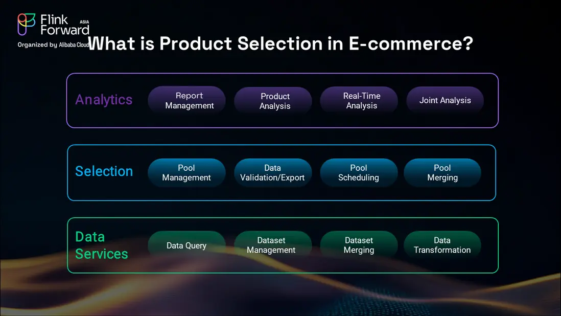 商品選品流程包含三個關鍵層級。最底層是數據服務層,為所有商品相關信息提供基礎設施支持。在其之上是選品層,SKU 被分組進入不同池中,並根據業務需求進行處理。最上層是分析層,使業務智能團隊能夠進行實時分析並做出數據驅動的決策。