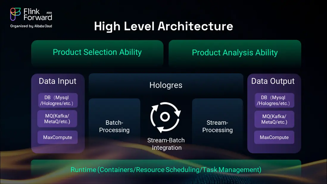 我們的解決方案以阿里雲實時計算 Flink 和 Hologres 為核心組件,構建了一個支持實時流處理與批處理能力的統一架構。該架構通過成熟的容器化和資源調度系統提供運行時可用性,並具備複雜的任務管理能力。