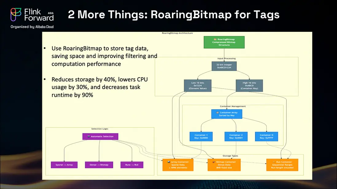 我們的團隊研究並實現了 Roaring Bitmap 技術,該技術使用 32 位整數並將其拆分為低 16 位和高 16 位,從而高效壓縮標籤數據。系統使用三種數據容器:稀疏數據使用數組容器,高密度數據使用位圖容器,連續範圍使用 run 容器。