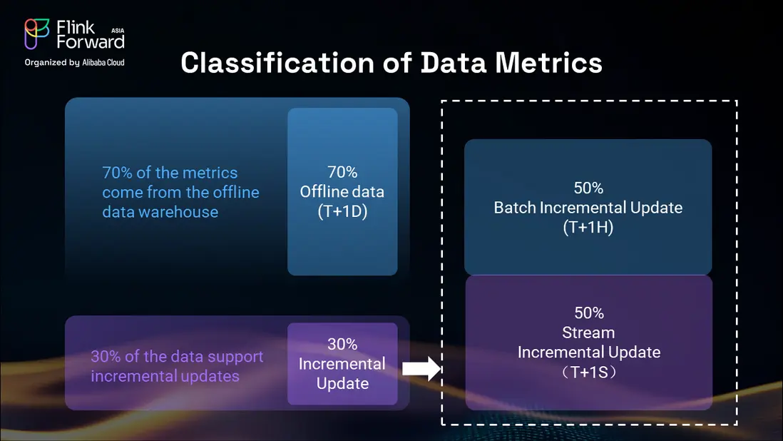 我們的分析顯示,電商平台上約 70% 的指標來自離線批處理數據倉庫操作,通常具有 T+1D(次日)的延遲。其餘 30% 由需要更及時更新的增量數據構成,我們進一步將其分為兩個不同的數據流。