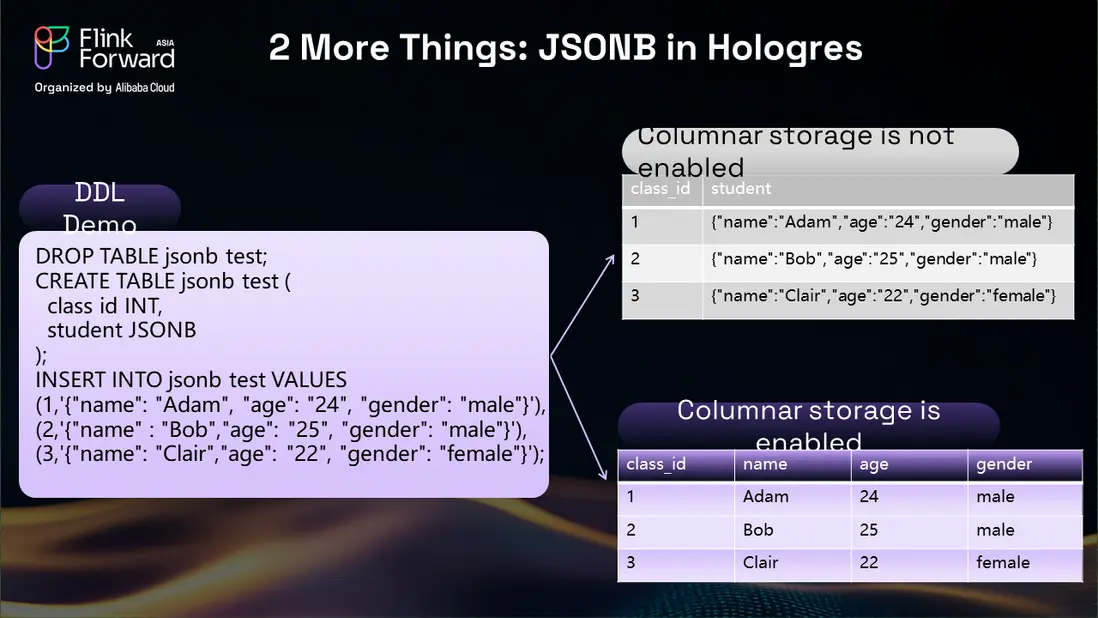 Hologres 的 JSON-B 支持為我們提供了所需的靈活性,它在列式存儲的同時,允許根據具體需求在存儲模式之間切換。當不需要列式存儲時,我們使用標準存儲模式;而當分析查詢需要列式訪問時,我們可以輕鬆切換到優化的列式存儲。