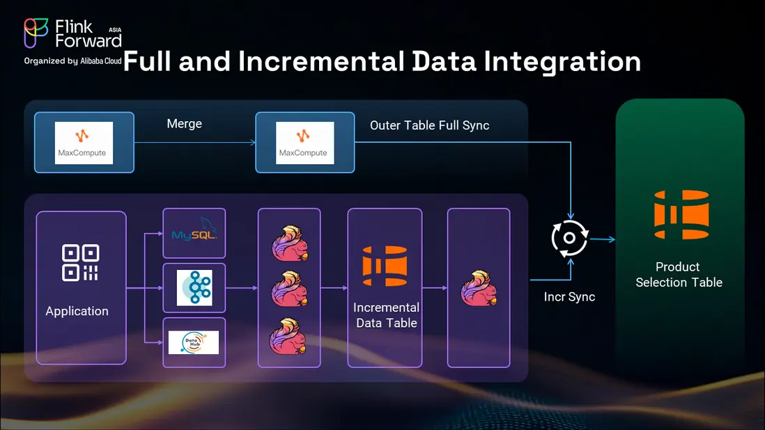增量數據處理涉及多個數據源,包括 MySQL、Kafka 和來自 MaxCompute 的每小時數據更新。我們使用 Flink 將這些數據同步到 Hologres 中的一箇中間增量數據表,該表作為不同數據源的匯聚點。