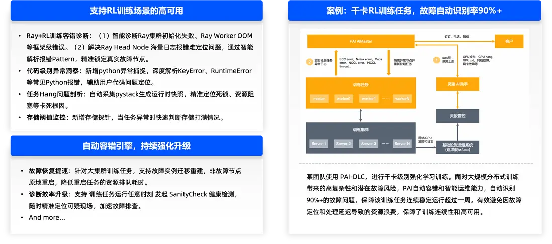 RayNative的容錯機制:針對Ray框架,按照應用層面和系統層,分別提供優化容錯機制,全面提升容錯能力。支持某大模型團隊,多個千卡RL任務,故障識別率90%+,Ray的RL訓練任務穩定運行超過一週(RL 任務pattern:千卡規模 x 運行幾天)
