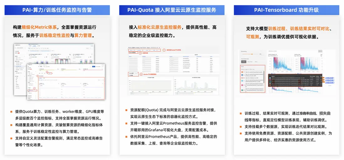 可觀測:構建覆蓋多資源類型的精細化Metric體系,為訓練穩定性監控、訓練調優、算力管理等場景,提供可視化數據支撐。提供 任務、POD、卡等多維度,數百個監控指標,支持Ray Dashboard, 並且對接雲監控和ARMS, 滿足客户雲上多樣的可觀測需求。