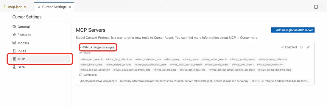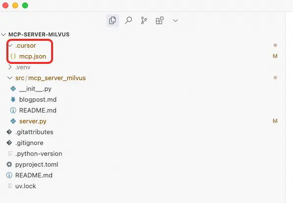 打開Clone的Milvus Mcp Project,在根目錄創建 .cursor 文件夾,並在其中mcp.json文件