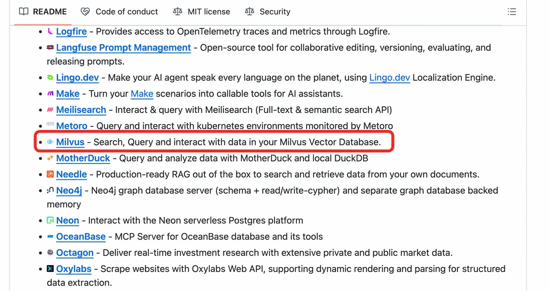 Milvus 已成為MCP官方集成服務:https://github.com/zilliztech/mcp-server-milvus