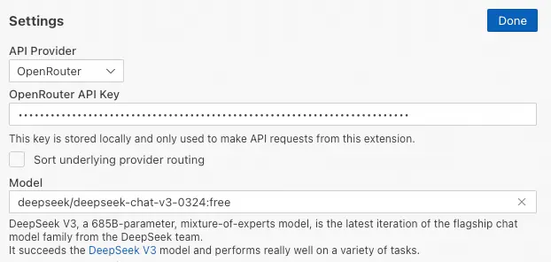 在Model選擇Deepseek-chat-v3,然後點擊右上角Done,完成配置。