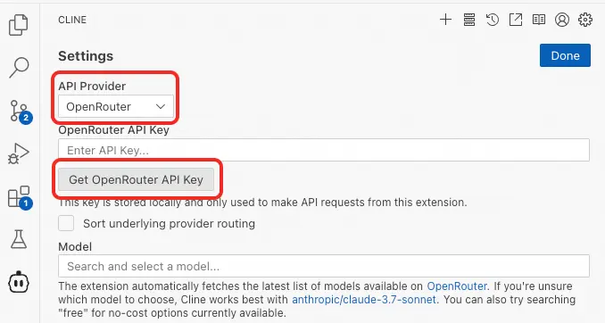 在API Provider中選擇OpenRouter,點擊Get API Key。