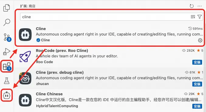 - 下載Cline:在VsCode的擴展欄目中,搜索並安裝Cline。