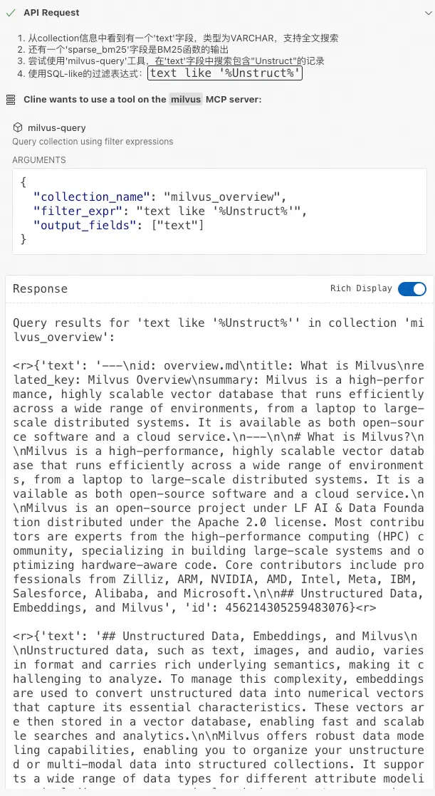 在Cline對話框中,輸入:在'milvus_overview' Collection中找到包含"Unstruct"的數據?