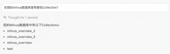 在Cursor對話框中,輸入:在我的milvus數據庫裏有哪些Collection?