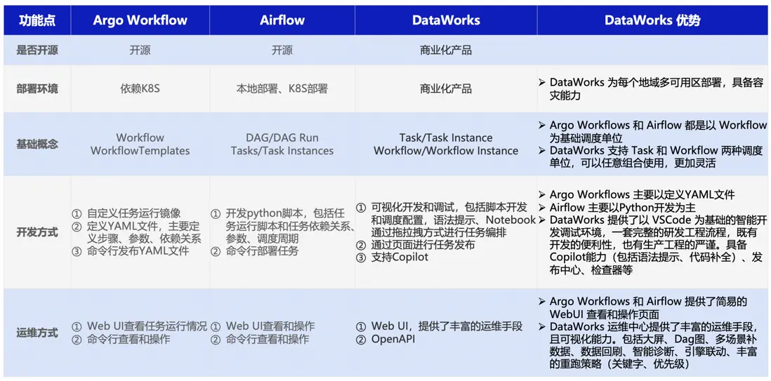 Argo vs Airflow vs DataWorks功能對比表