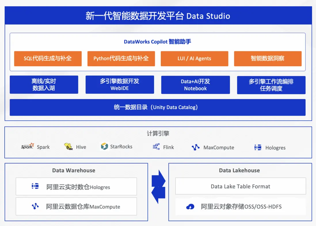 - 湖倉一體多引擎協同數據開發平台:支持湖與倉統一元數據管理、數據入湖、統一數據開發 WebIDE、統一任務編排調度;