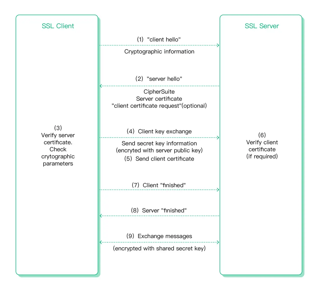 下圖展示了 TLS/SSL 握手協議的過程,從客户端的 "hello" 一直到服務器的 "finished" 完成握手。