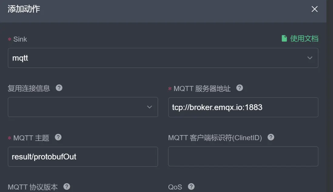 protoDemo中的內容,發送到 MQTT 主題result/protobuf中。{ "id": "ruleDecode", "sql": "SELECT * FROM protoDemo", "actions": [{ "mqtt": { "server": "tcp://broker.emqx.io:1883", "topic": "result/protobuf", "sendSingle": true } }] } -