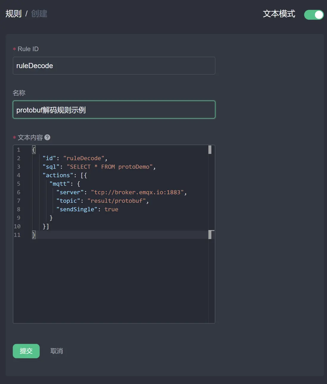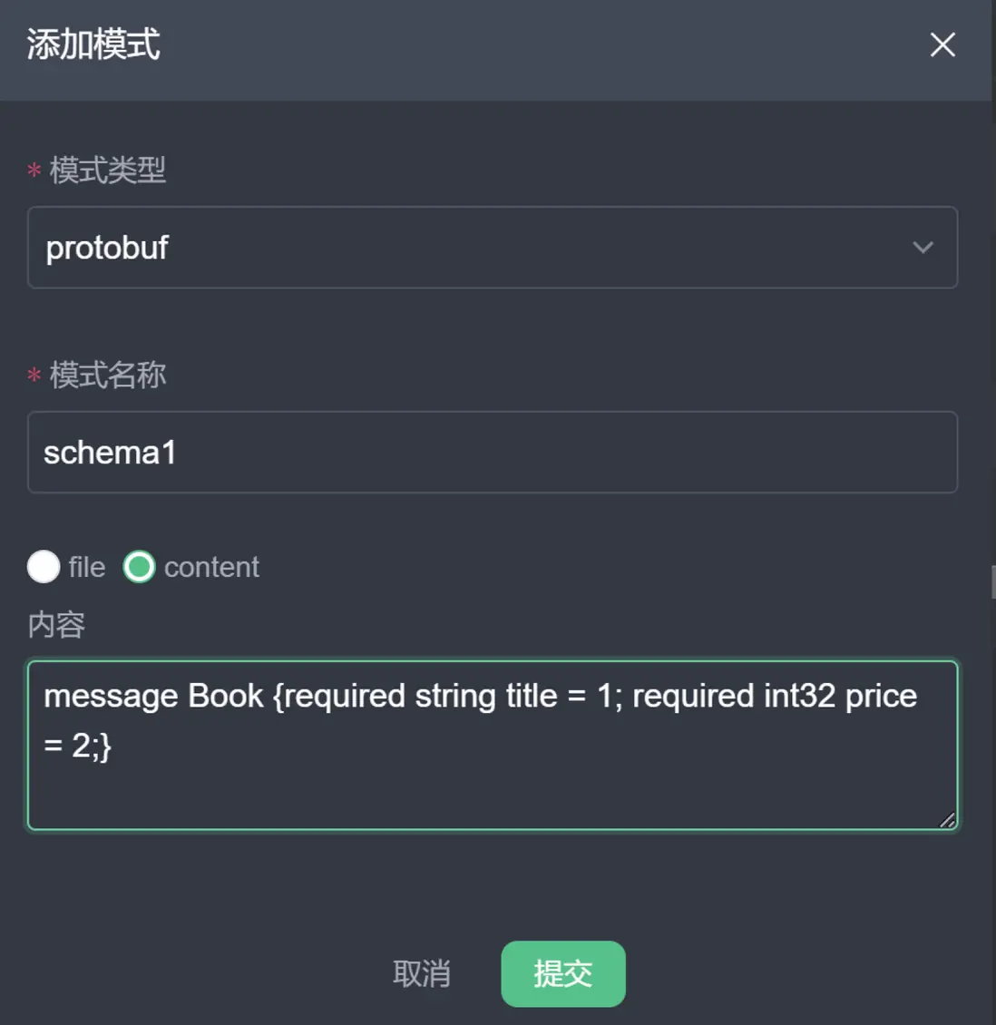 protobuf;模式名稱可輸入自定義的不重複的名稱作為後續規則創建中模式的標識 id;模式內容可採用文件或者文本內容填寫。選擇 file 的情況下,需要填寫文件所在的 url;本教程使用的模式較為簡單,因此可選擇 content,然後在內容框中填入 proto 文件的文本。 -