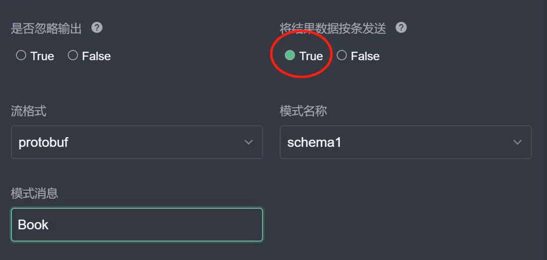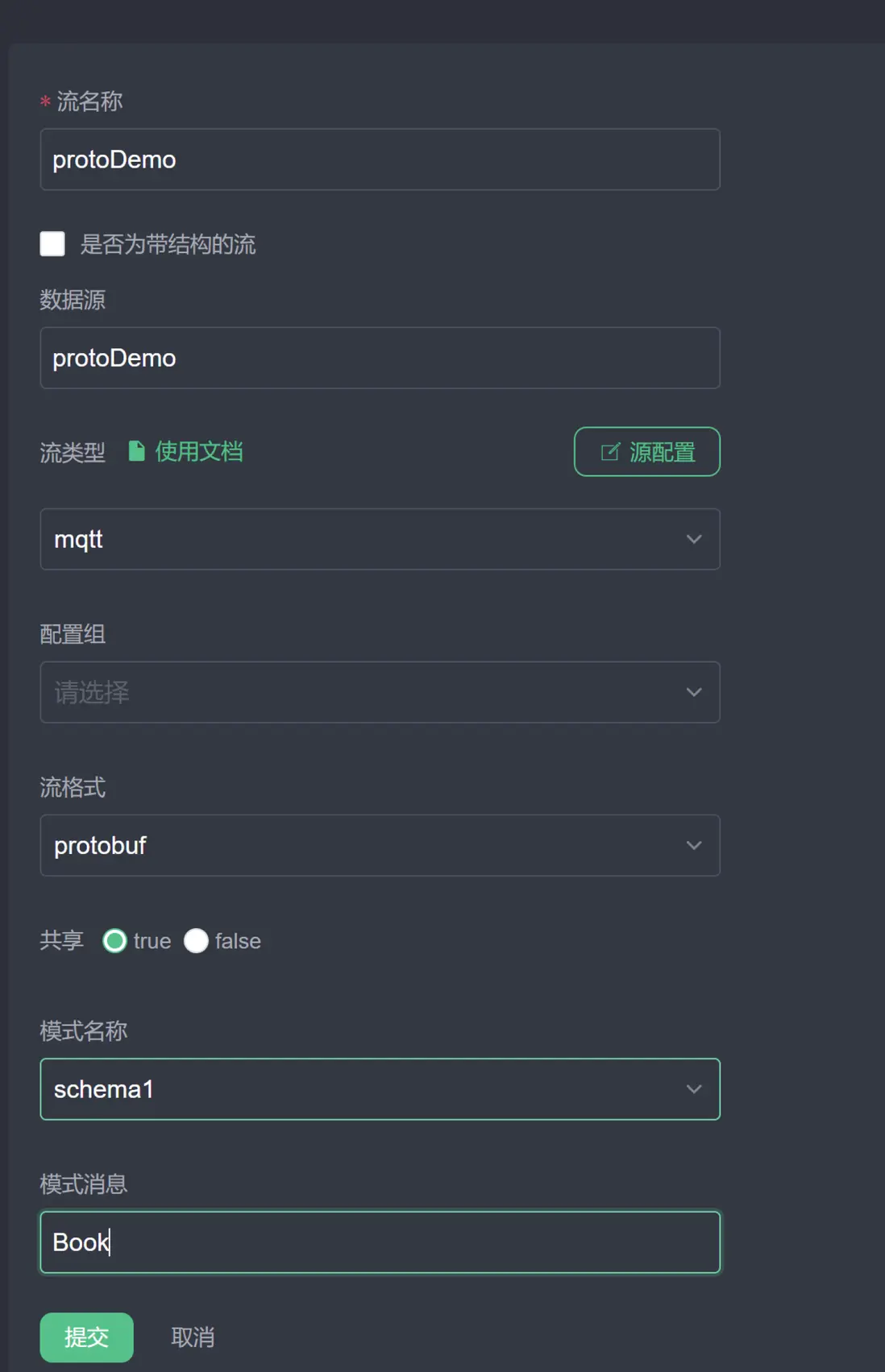 protobuf;模式名稱選擇上一步註冊的schema1;模式消息設置為 proto 文件裏定義的 messageBook。該配置表示數據流protoDemo將監聽 MQTT 主題protoDemo,收到二進制數據後將採用schema1中的Book的格式進行 protobuf 解碼。點擊提交,在流列表中應當列出新創建的流。 -
