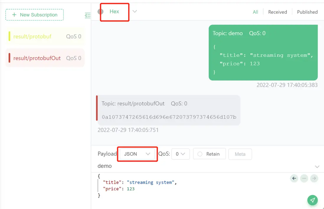 protoDemo,Payload 格式為Hex, 發送根據 schema1 中 Book 格式編碼的二進制數據,例如0a1073747265616d696e672073797374656d107b。 -