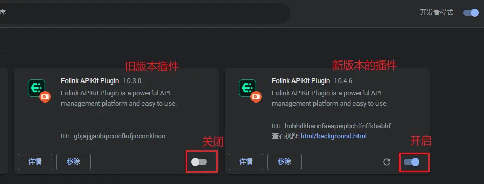 然後打開 Chrome 瀏覽器,輸入地址 chrome://extensions/ ,開啓右上角的開發者模式按鈕,點擊左上角加載已解壓的擴展程序按鈕,選擇剛才的 eolinker_plugins 文件夾,然後啓用插件。