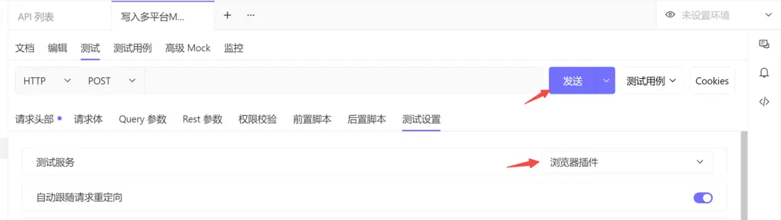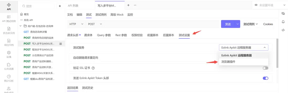 安裝完瀏覽器測試插件後,在 Eolink Apikit 的 API 測試頁面,點擊測試設置,測試服務中選擇瀏覽器插件,再點擊發送按鈕即可切換到插件方式進行測試。