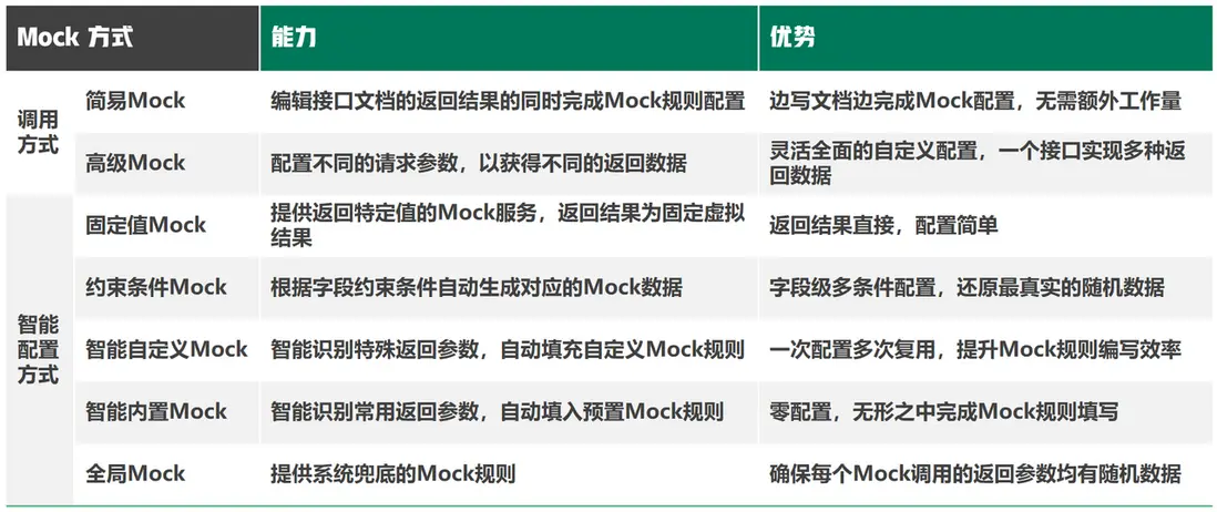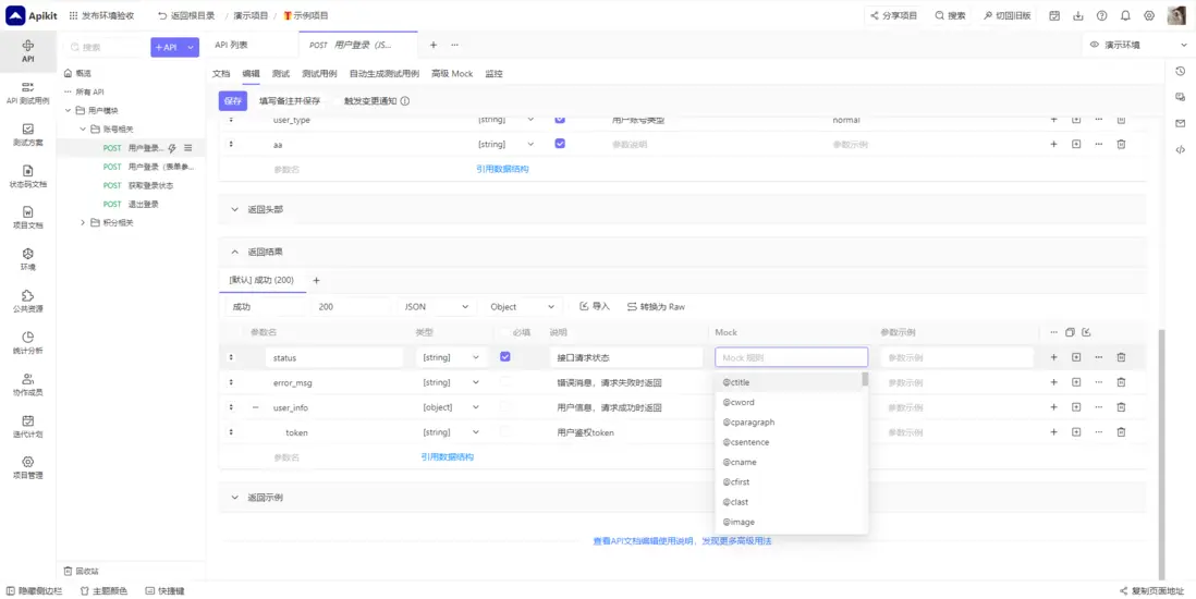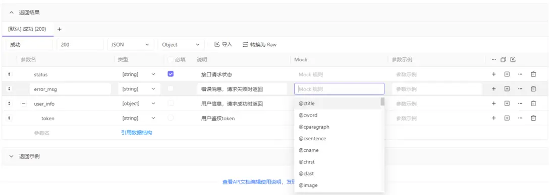 簡易Mock功能可在編寫API文檔的時候,同時對不同的返回結果進行Mock配置。並且可預置智能Mock規則,在編寫返回參數時,若參數名和字段類型匹配智能Mock規則時,系統自動填入該參數的Mock規則。