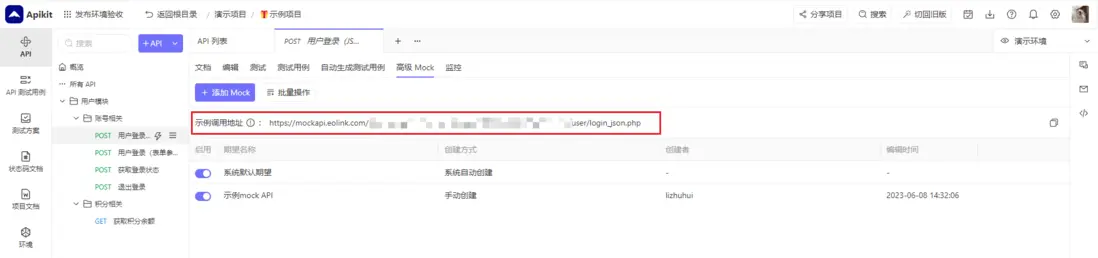 配置簡易Mock後,API文檔會自動生成Mock URL,用户可複製該URL直接調用得出想要的數據結果。