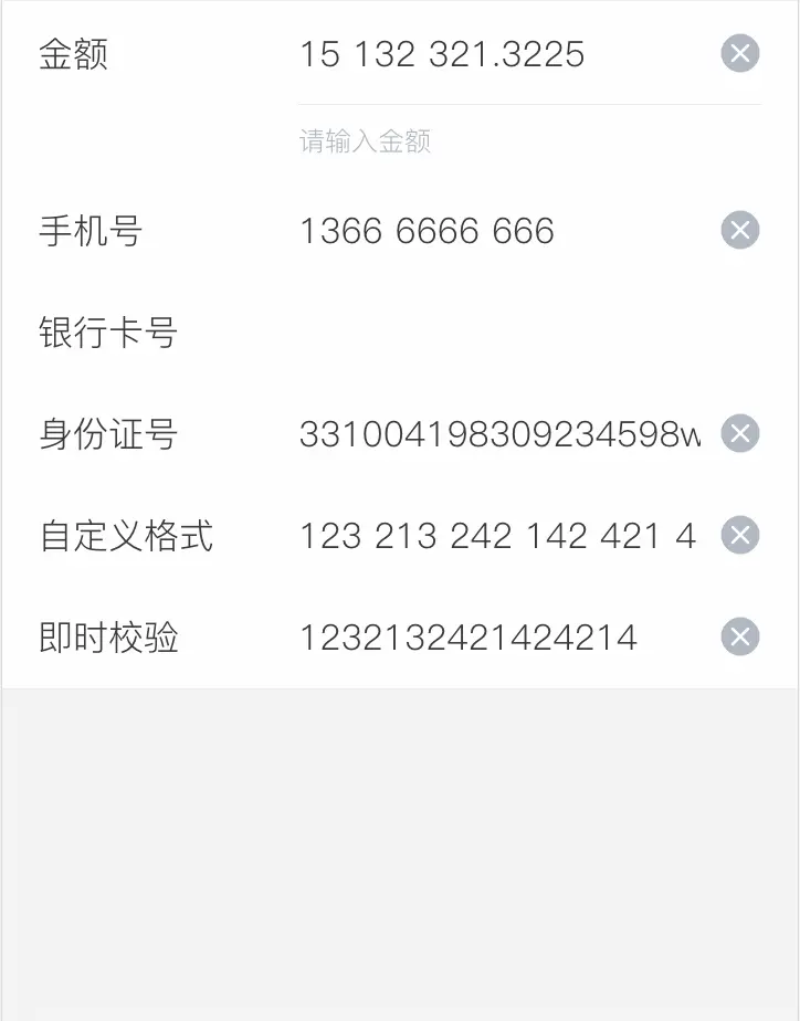 分析一下格式化的話的過程,如上面的情況,輸入 18758 時,因為要做針對卡號的格式化,所以會將原有的值轉變為 "1875 8",從字符串長度上來看,從 5 位變成了 6 位,那麼如果此時光標位置沒有在值變化時跳到最後一位,則會停留在空格處,看起來就好像錯格了一位,連續輸入時就會有問題。
