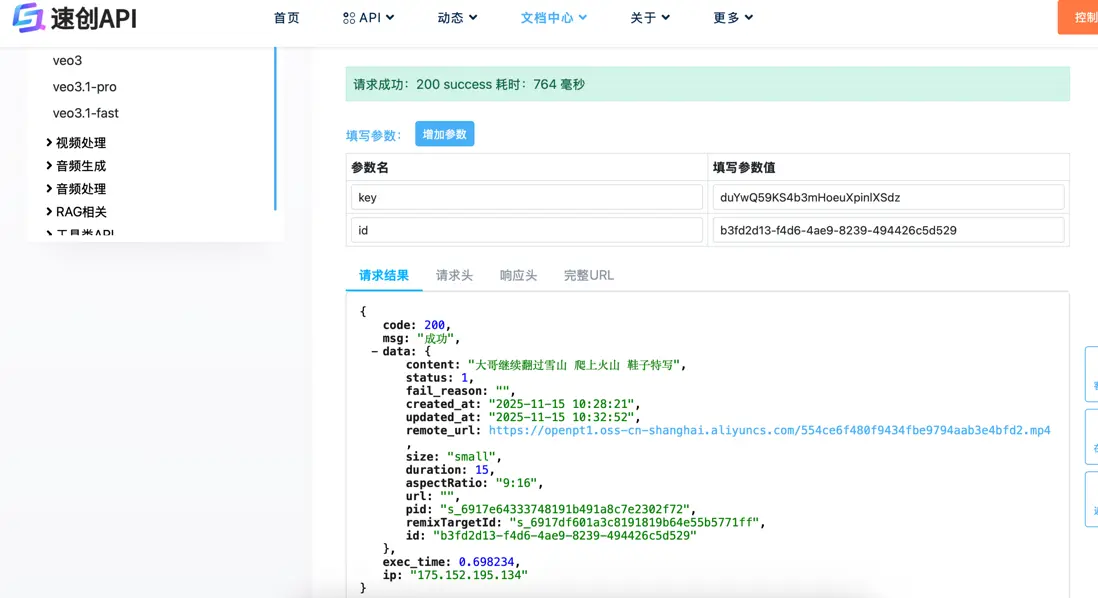 提交任務後,若未立即返回視頻鏈接,可通過返回的 id 調用「任務狀態查詢接口」輪詢結果,直到 status 變為 1(成功)或 2(失敗)。